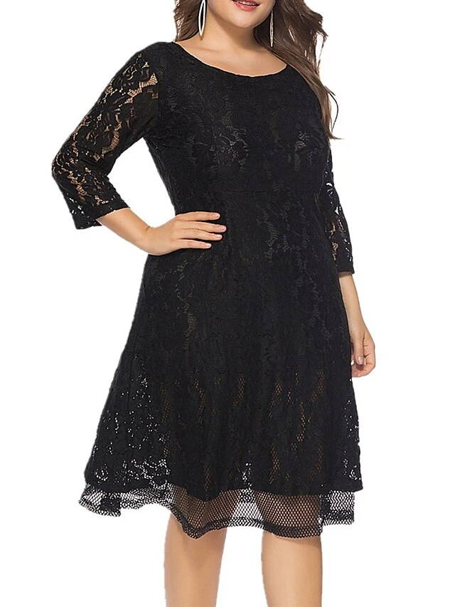 Women’s Plus Size Curve Party Dress Lace Dress Solid Color Midi Dress 3/4 Length Sleeve Lace Patchwork Crew Neck Fashion Wedding Black Spring Fall XL XXL 3XL 4XL 5XL