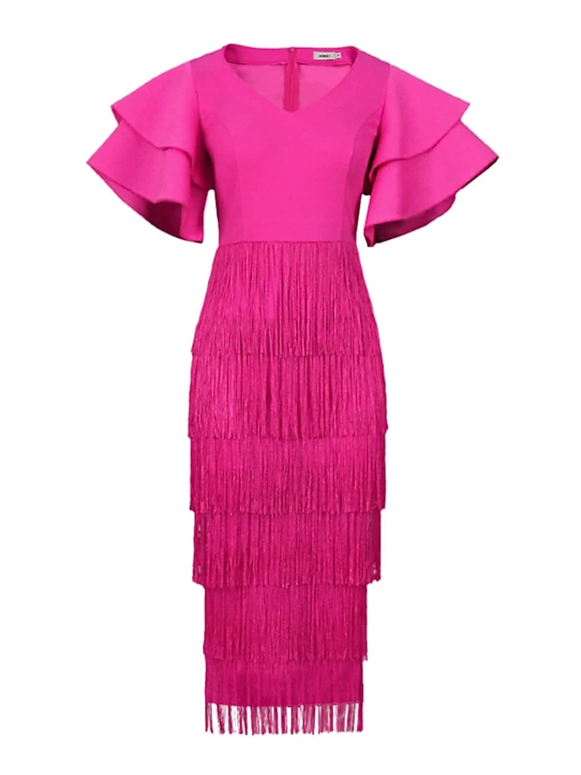 Women‘s Plus Size Curve Party Dress Pure Color V Neck Short Sleeve Spring Fall Stylish Prom Dress Midi Dress Party Vacation Dress Fringe Dress
