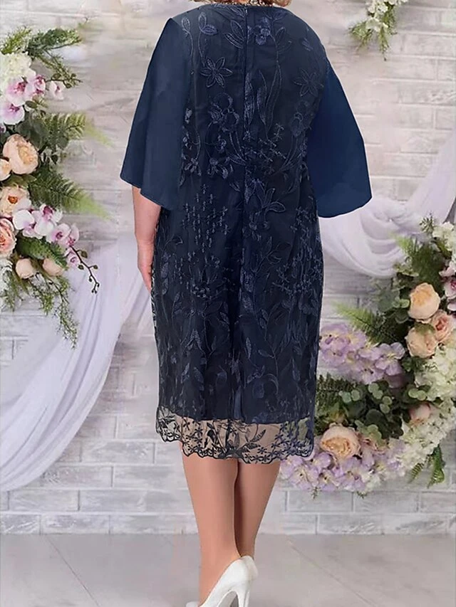 Women’s Plus Size Curve Party Dress Semi Formal Dress Floral Midi Dress Half Sleeve Lace Embroidered Crew Neck Elegant Party Deep Blue Fall Winter L XL XXL 3XL 4XL
