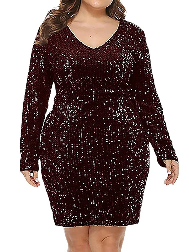 Women’s Plus Size Curve Party Dress Sequin Dress Homecoming Dress Solid Color Plain Mini Dress Long Sleeve V Neck Fashion Party Black Wine Fall Winter XL XXL 3XL 4XL 5XL