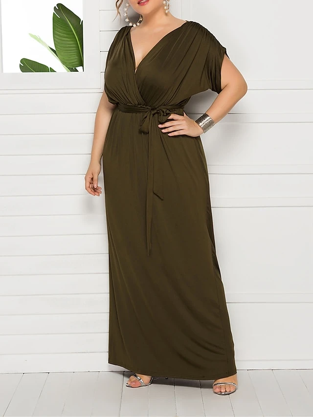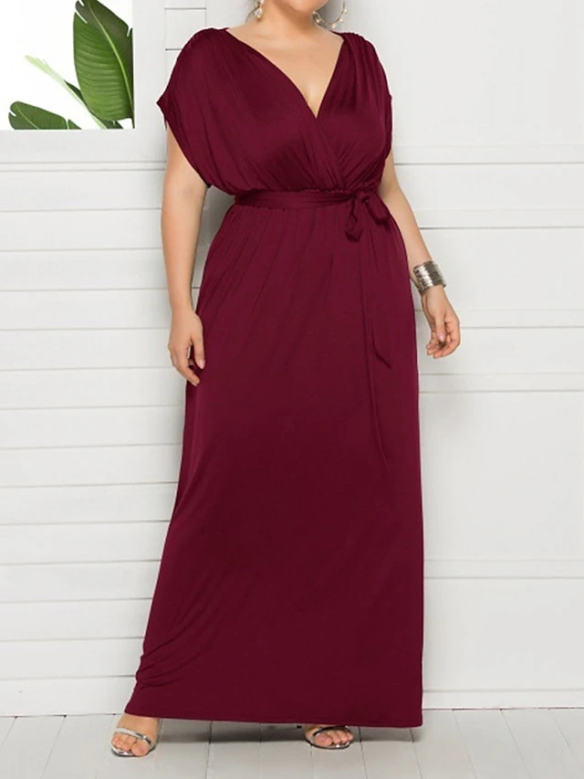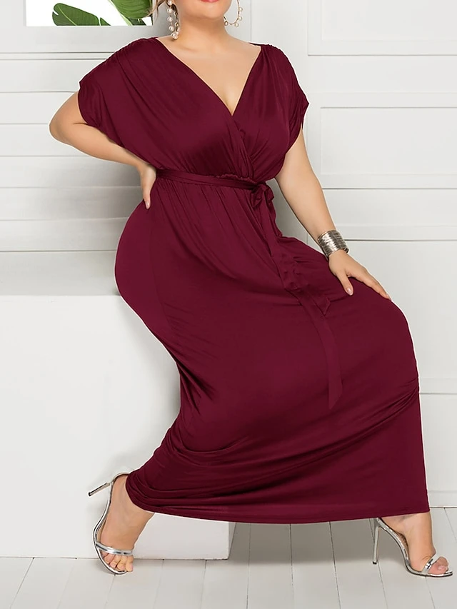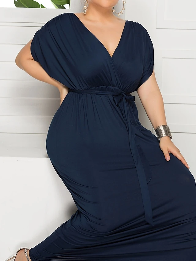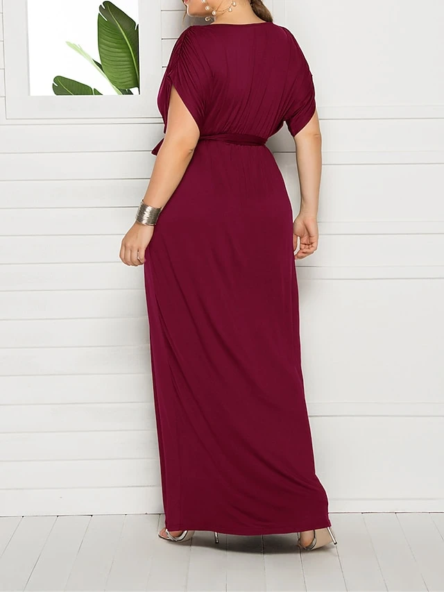 Women’s Plus Size Curve Party Dress Sheath Dress Formal Dress Maxi Dress White Wine Royal Blue Short Sleeve Pure Color Lace Up Spring Fall Autumn V Neck Fashion Birthday Wedding Guest Vacation