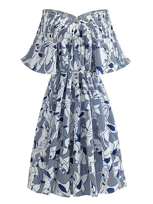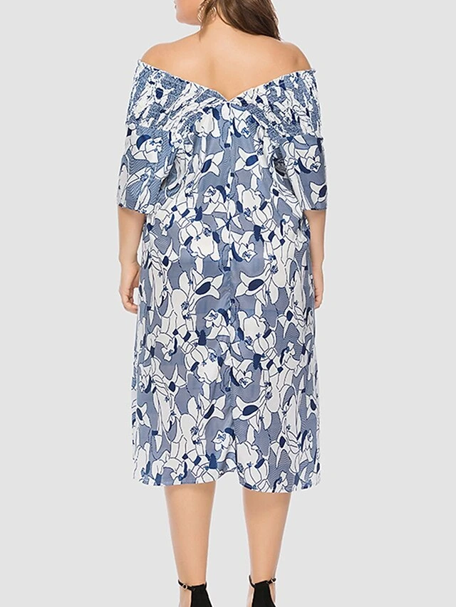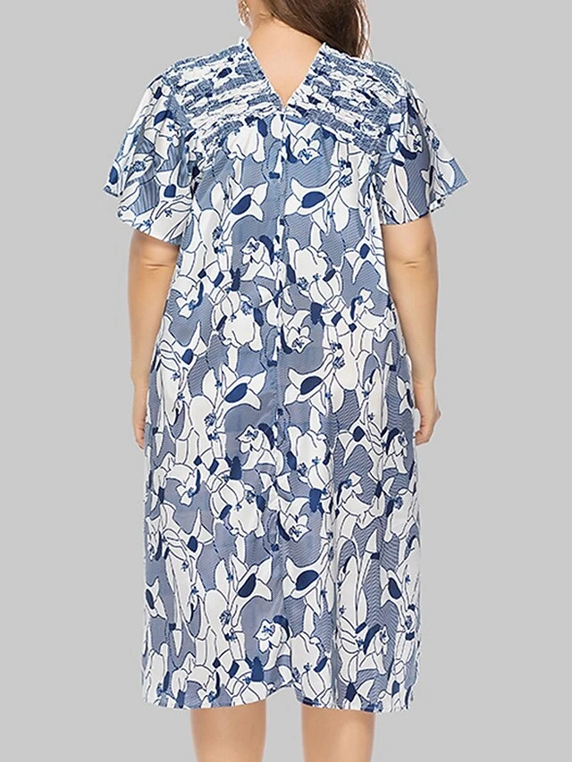 Women‘s Plus Size Curve Party Dress Shift Dress Semi Formal Dress Midi Dress Blue Short Sleeve Floral Ruffle Summer Spring Fall V Neck Fashion Wedding Guest Vacation Summer Dress 2023