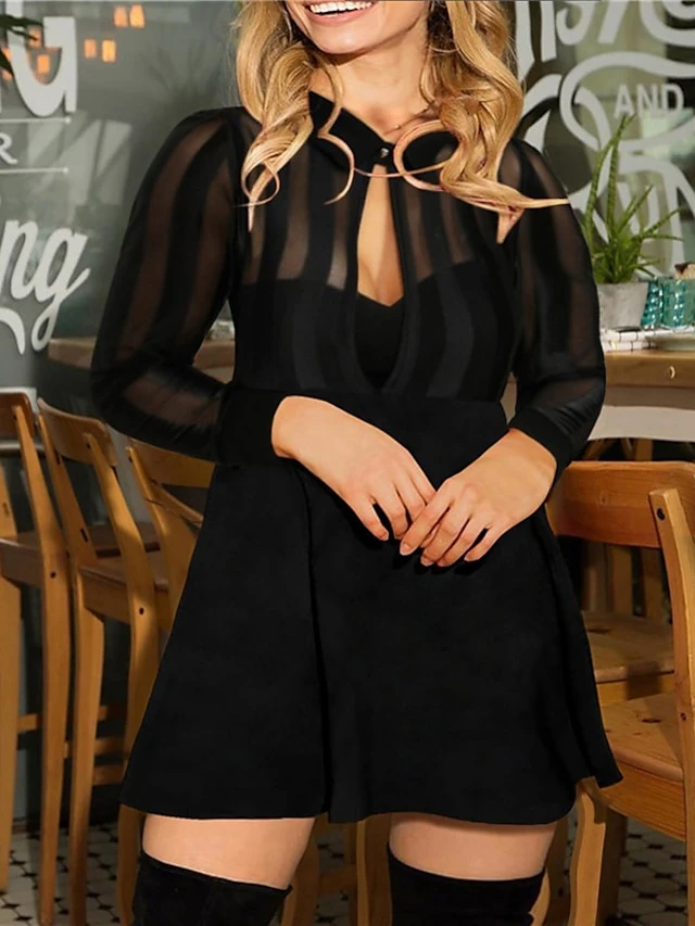 Women‘s Plus Size Curve Party Dress Solid Color V Neck Mesh Long Sleeve Spring Fall Casual Sequins Prom Dress Mini Dress Party Evening Party Dress Black Dress Sequin Dress