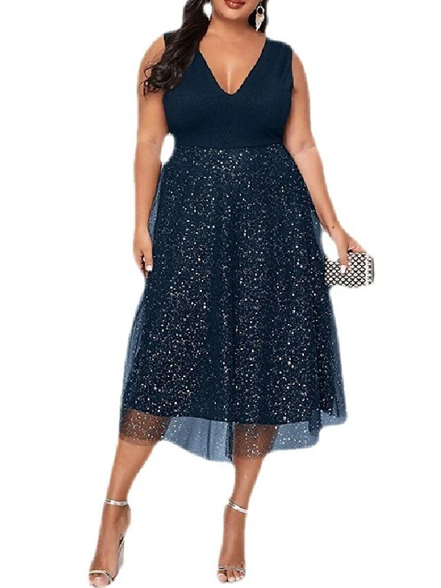 Women‘s Plus Size Curve Party Dress Solid Color V Neck Mesh Sleeveless Spring Fall Elegant Sexy Sequins Prom Dress Midi Dress Formal Party Dress Sequin Dress Homecoming Dress Print