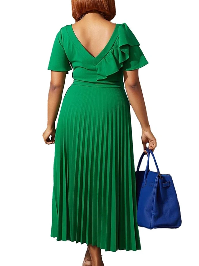 Women‘s Plus Size Curve Party Dress Solid Color V Neck Ruched Short Sleeve Fall Spring Work Prom Dress Maxi Long Dress Party Holiday Dress Ruffle