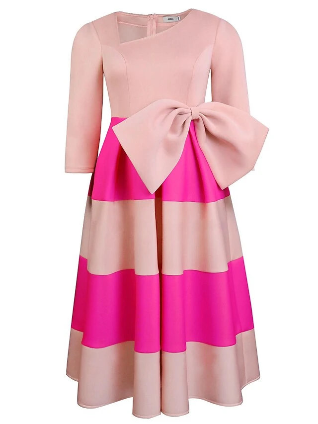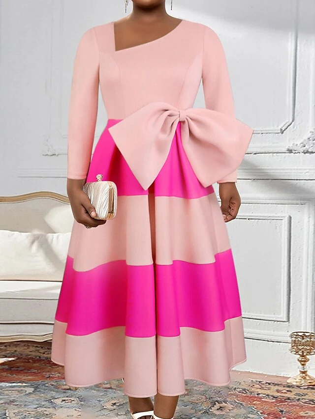 Women’s Plus Size Curve Party Dress Swing Dress A Line Dress Color Block Midi Dress Long Sleeve Bow V Neck Fashion Party Pink Fall Winter XL XXL 3XL 4XL