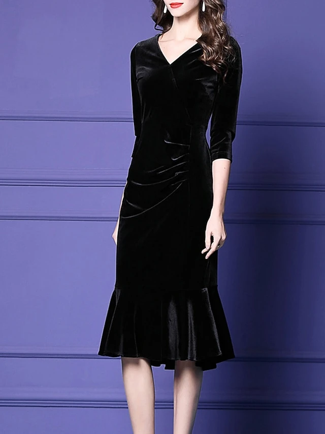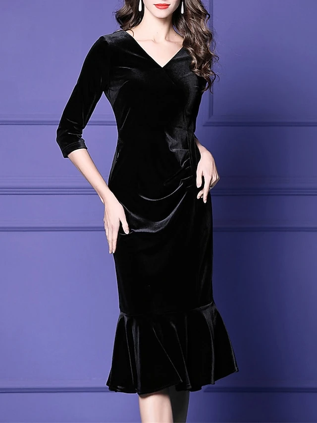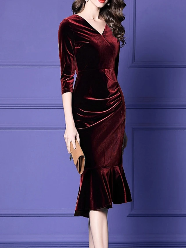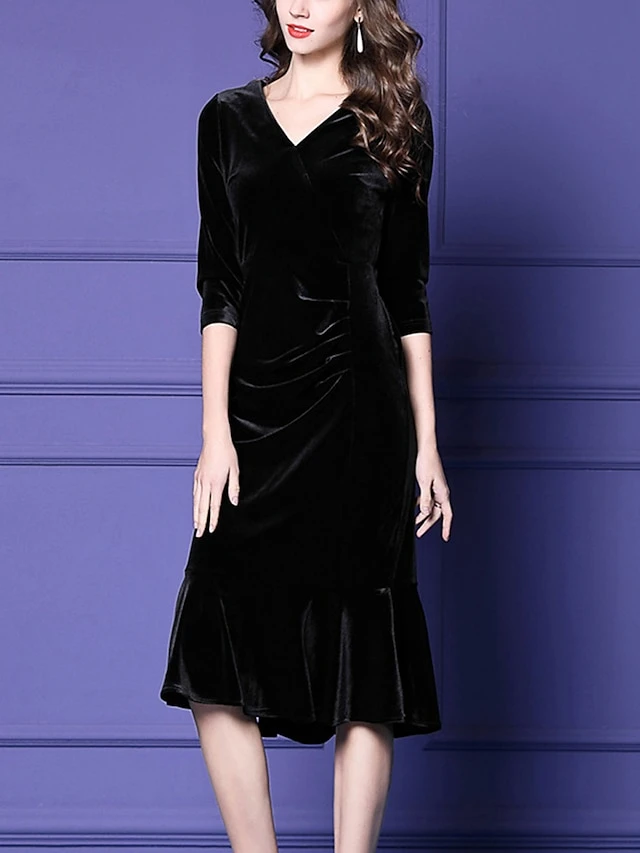 Women’s Plus Size Curve Party Dress Velvet Dress Winter Dress Solid Color Midi Dress Long Sleeve Ruched V Neck Fashion Party Black Wine Fall Winter L XL XXL 3XL 4XL