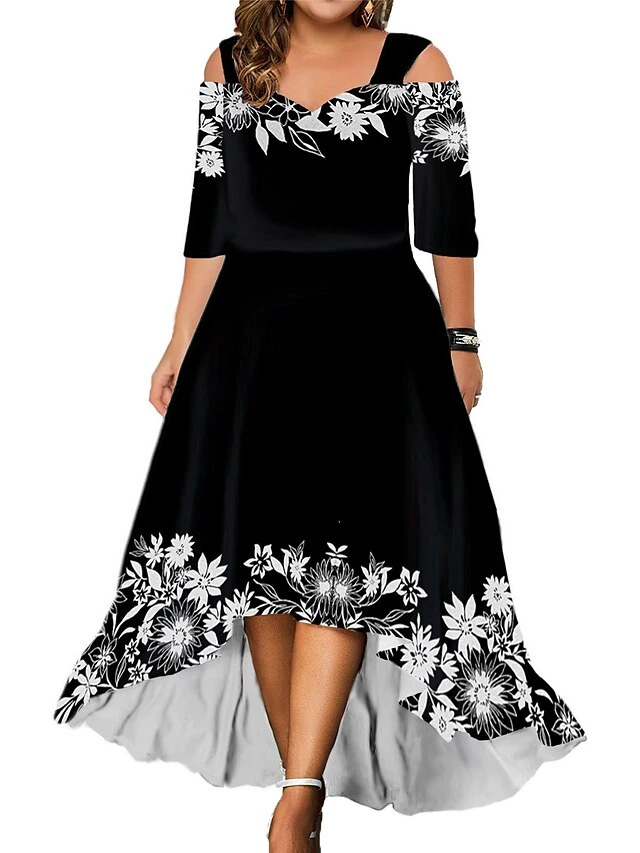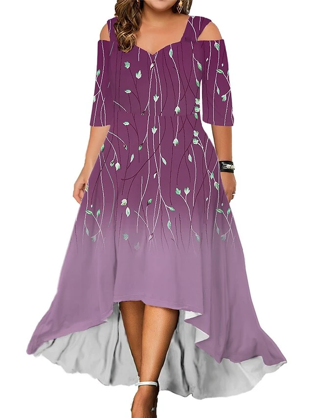 Women‘s Plus Size Curve Party Dress Wedding Guest Dress Swing Dress Long Dress Maxi Dress Black Blue Purple 3/4 Length Sleeve Floral Cold Shoulder Summer Spring Fall V Neck Fashion Birthday