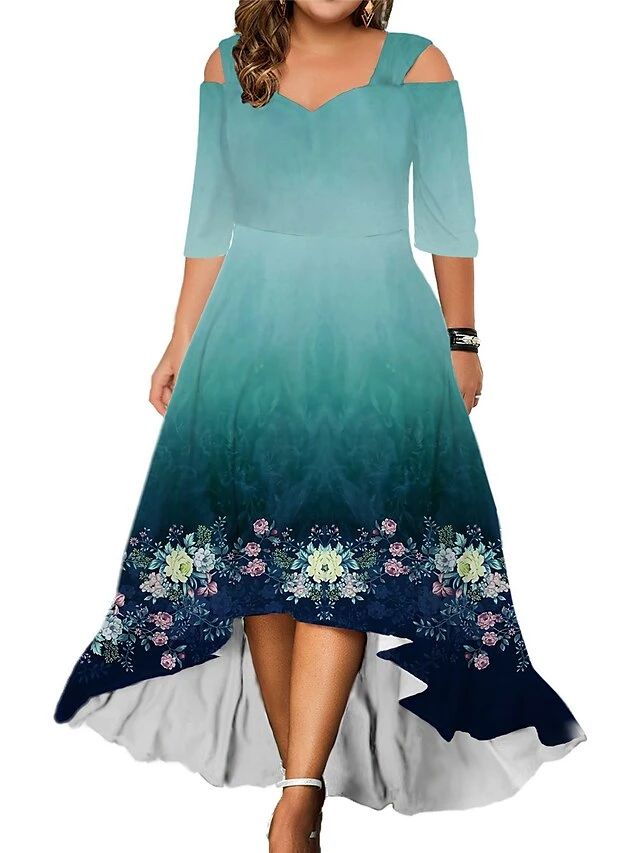 Women‘s Plus Size Curve Party Dress Wedding Guest Dress Swing Dress Long Dress Maxi Dress Black Pink Red 3/4 Length Sleeve Floral Cold Shoulder Summer Spring Fall V Neck Fashion Birthday Wedding Guest