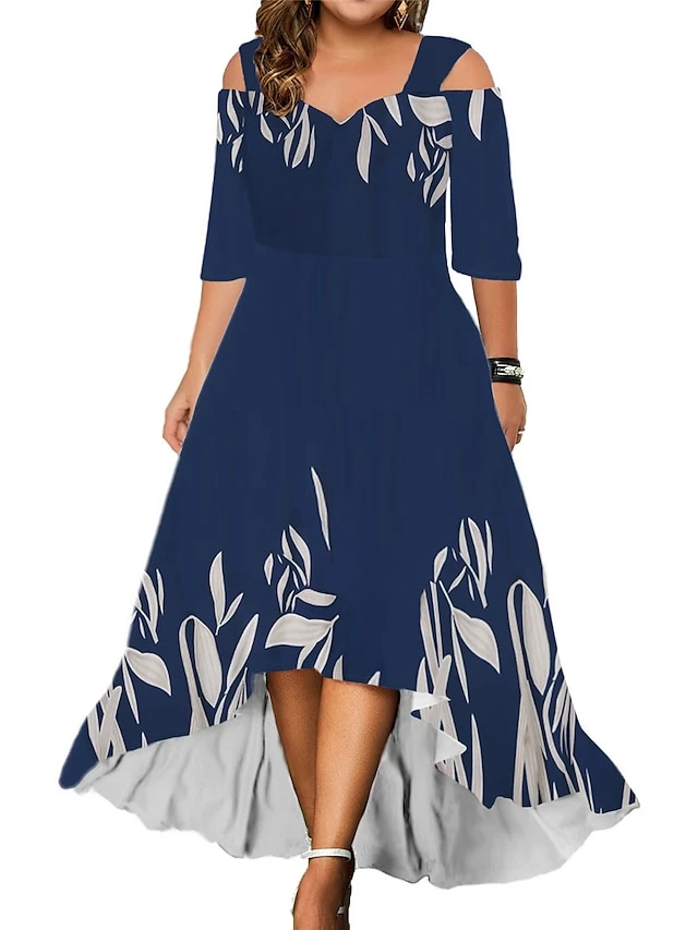 Women‘s Plus Size Curve Party Dress Wedding Guest Dress Swing Dress Long Dress Maxi Dress Pink Blue Green 3/4 Length Sleeve Leaf Cold Shoulder Summer Spring Fall V Neck Fashion Birthday Wedding Guest
