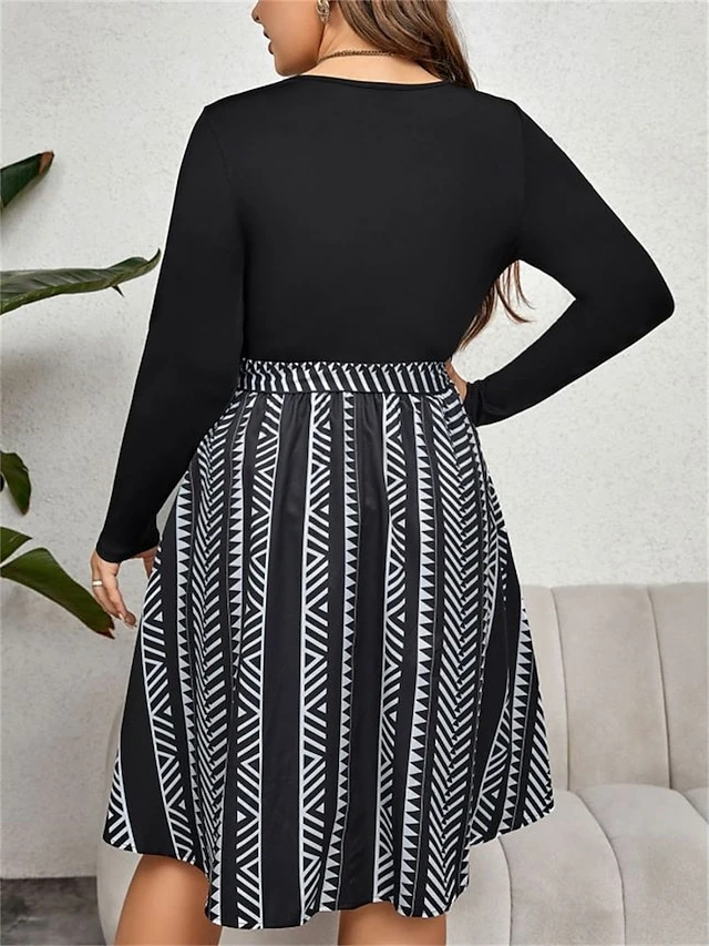 Women’s Plus Size Curve Party Dress Winter Dress Black Dress Geometric Midi Dress Long Sleeve Patchwork Bow Crew Neck Fashion Party Black Fall Winter XL XXL 3XL 4XL