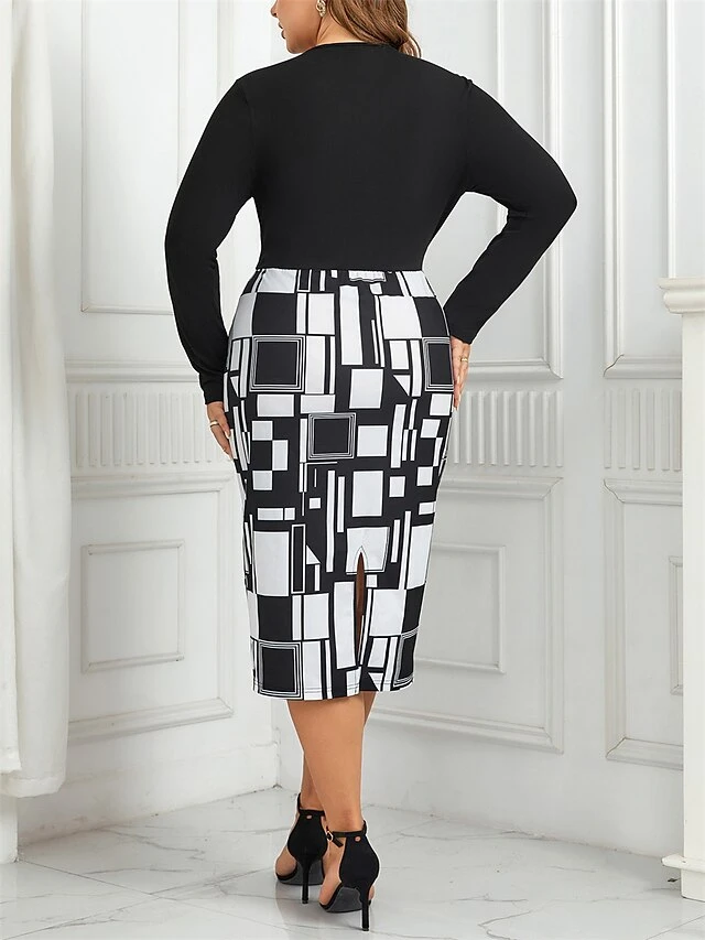 Women’s Plus Size Curve Party Dress Winter Dress Bodycon Geometric Midi Dress Long Sleeve Patchwork Print V Neck Fashion Party Black Fall Winter XL XXL 3XL 4XL