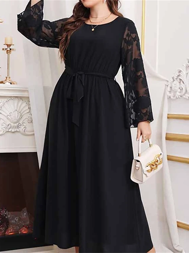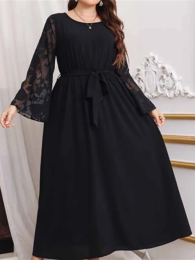 Women’s Plus Size Curve Prom Dress Party Dress Wedding Guest Dress Long Dress Maxi Dress Black Long Sleeve Pure Color Lace Up Fall Winter Autumn Crew Neck Fashion Evening Party Wedding Guest