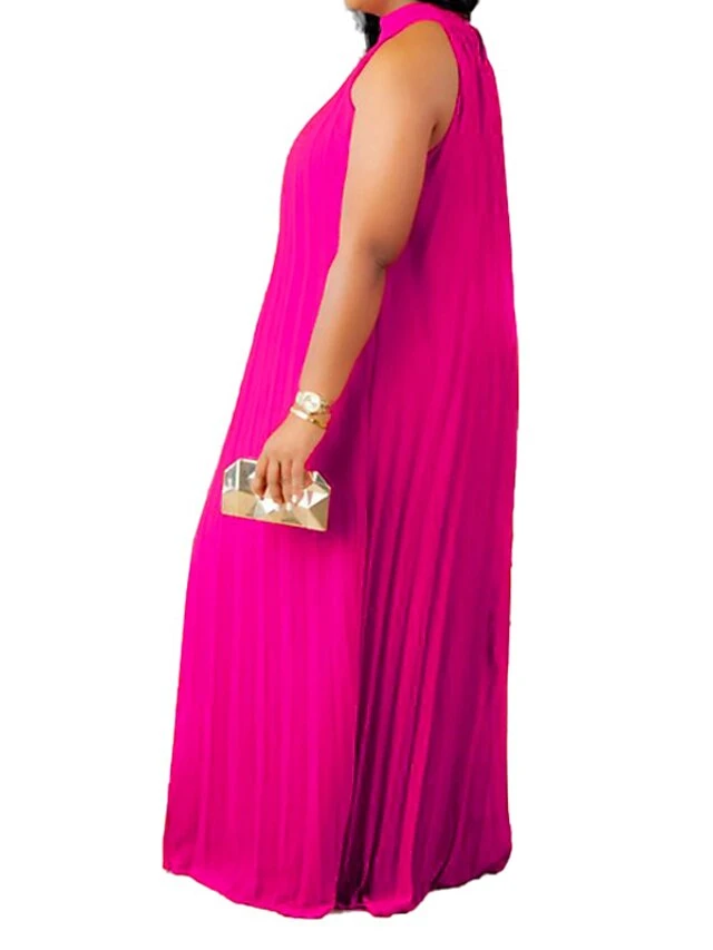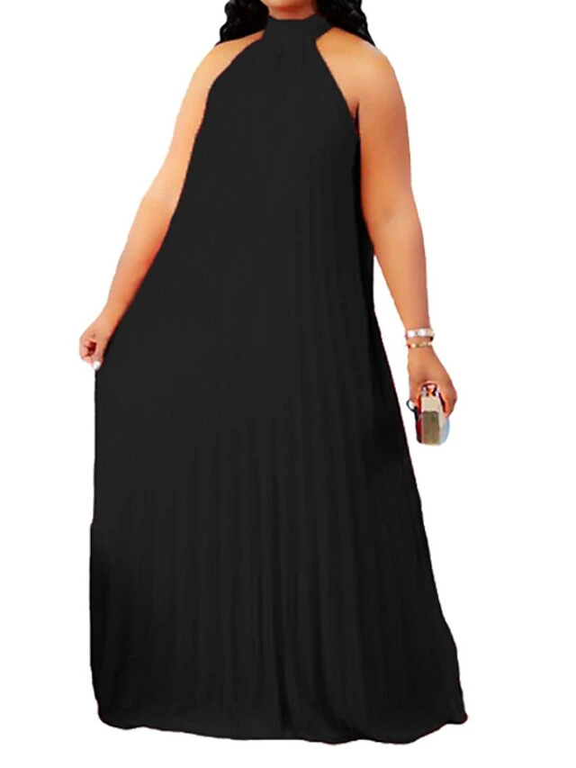 Women’s Plus Size Curve Shift Dress Solid Color Halter Neck Ruched Sleeveless Spring Summer Basic Maxi Long Dress Casual Daily Dress