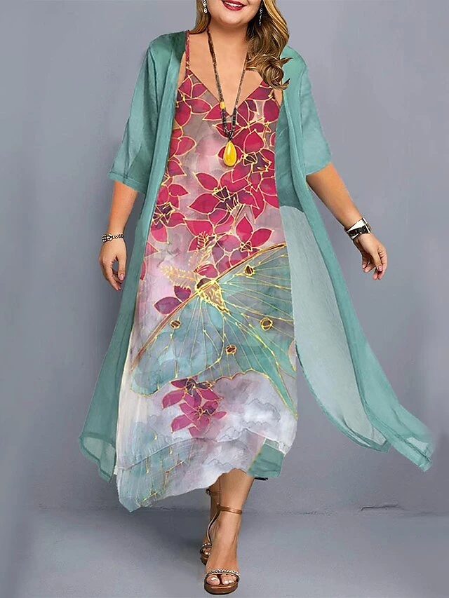 Women‘s Plus Size Curve Two Piece Dress Floral Crew Neck Print 3/4 Length Sleeve Fall Spring Casual Maxi Long Dress Daily Holiday Dress