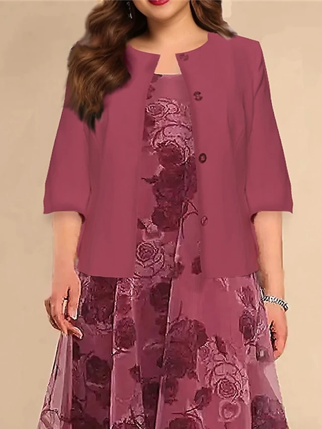 Women’s Plus Size Curve Two Piece Dress Set Casual Dress Print Dress Outdoor Daily Fashion Elegant Layered Print Midi Dress Crew Neck 3/4 Length Sleeve Floral Fuchsia Spring Fall L XL XXL 3XL 4XL