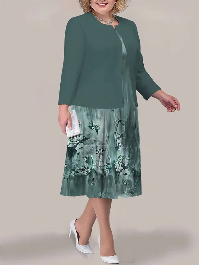 Women’s Plus Size Curve Two Piece Dress Set Casual Dress Print Dress Outdoor Office Fashion Streetwear Print Midi Dress Crew Neck Long Sleeve Floral Black Light Green Blue Fall Winter L XL XXL