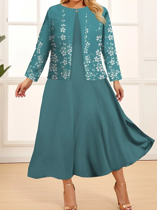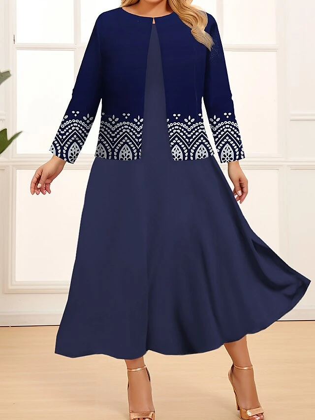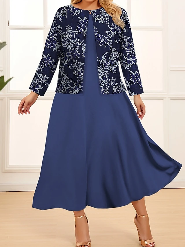 Women’s Plus Size Curve Two Piece Dress Set Casual Dress Swing Dress Outdoor Office Fashion Streetwear Print Midi Dress Crew Neck Long Sleeve Floral Wine Navy Blue Royal Blue Spring Fall L XL