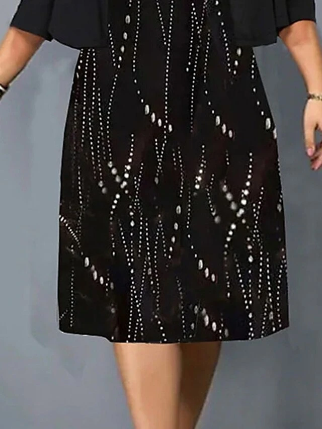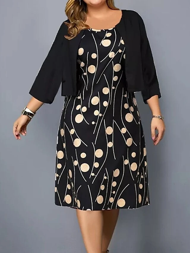 Women‘s Plus Size Curve Two Piece Dress Set Work Dress Print Dress Outdoor Office Fashion Work Print Midi Dress Crew Neck 3/4 Length Sleeve Polka Dot Regular Fit Black Apricot Fall Winter L XL XXL 3XL