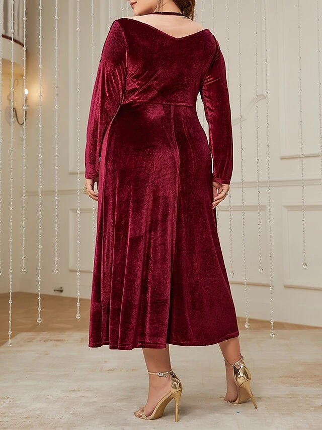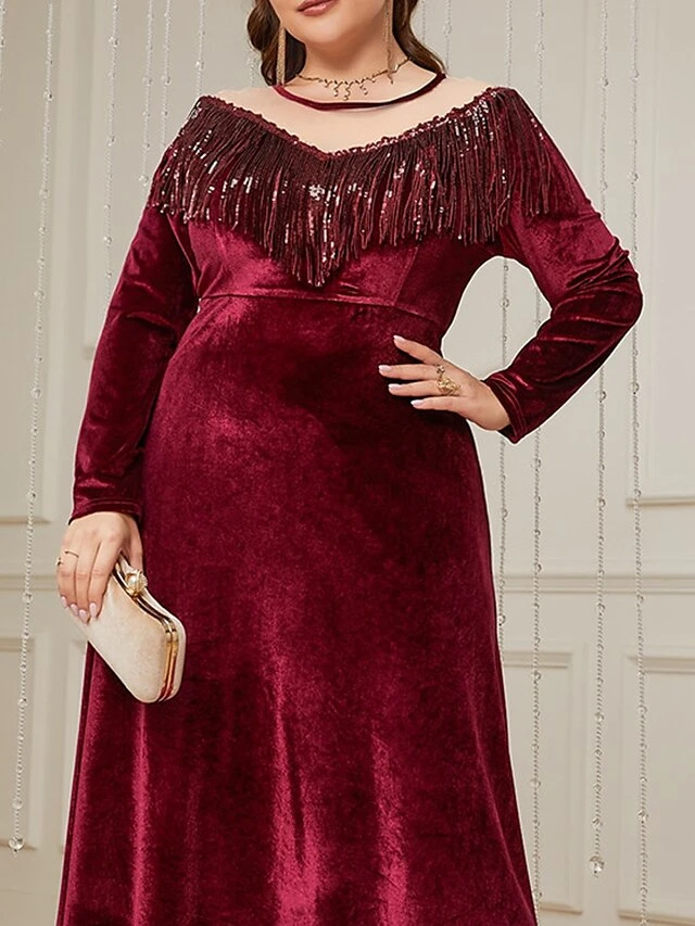Women’s Plus Size Curve Velvet Dress Casual Dress Winter Dress Plain Long Dress Maxi Dress Long Sleeve Tassel Fringe V Neck Fashion Outdoor Burgundy Fall Winter L XL XXL 3XL 4XL