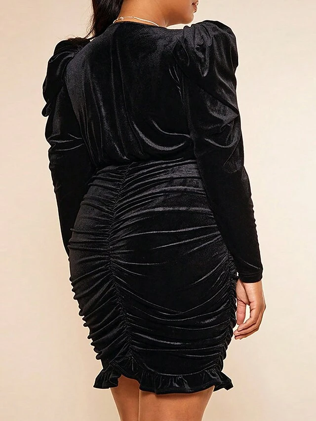 Women’s Plus Size Curve Velvet Dress Casual Dress Winter Dress Solid Color Mini Dress Long Sleeve Ruched V Neck Fashion Outdoor Black Fall Winter XL XXL 3XL