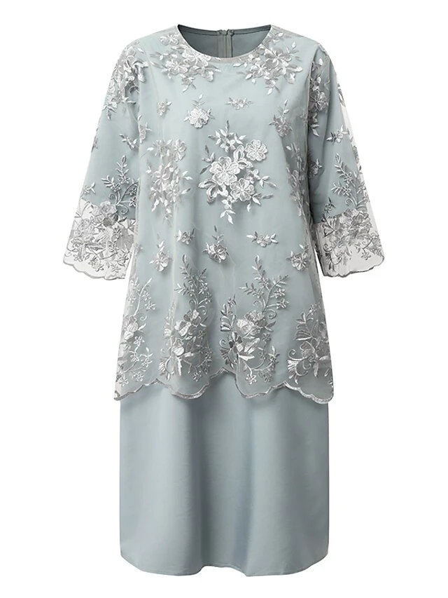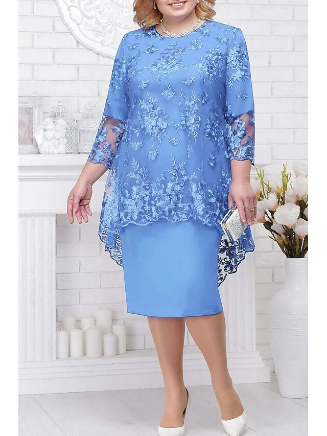 Women’s Plus Size Curve Wedding Guest Dress Lace A Line Dress Floral Round Neck Lace 3/4 Length Sleeve Spring Summer Casual Mother‘s Day Knee Length Dress Daily Holiday Dress