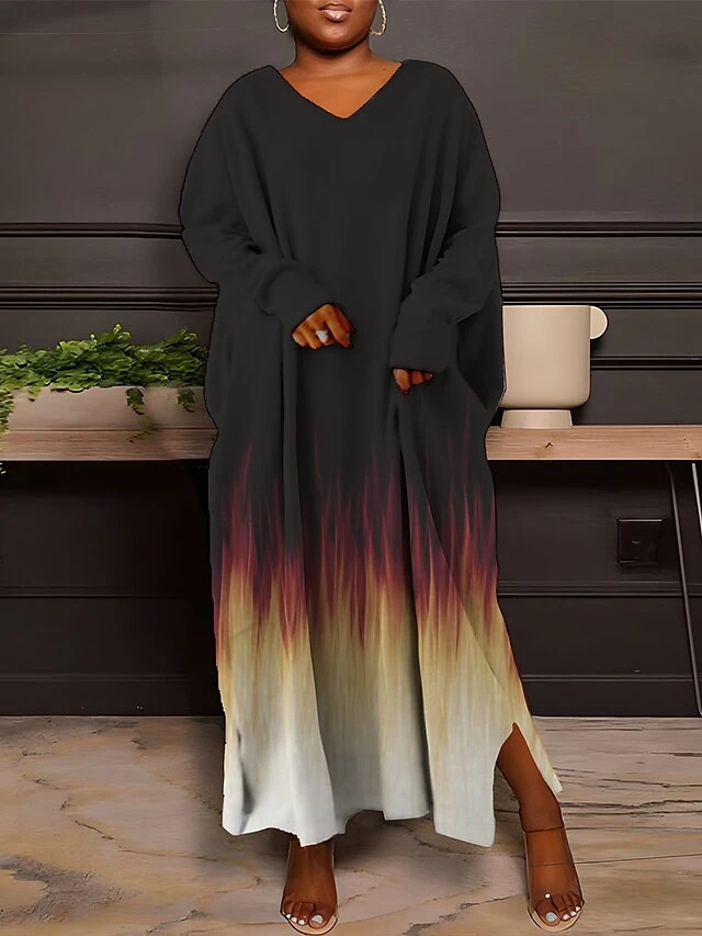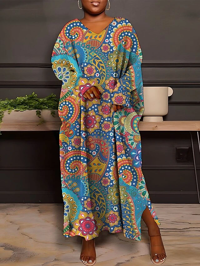 Women’s Plus Size Curve Winter Dress Paisley Dress Casual Dress Floral Paisley Long Dress Maxi Dress Long Sleeve Split Print V Neck Fashion Outdoor Black Royal Blue Fall Winter L XL XXL 3XL 4XL
