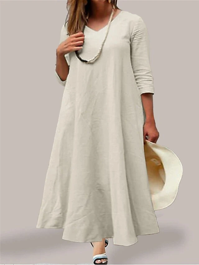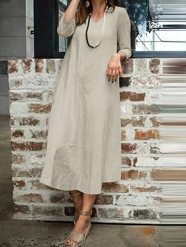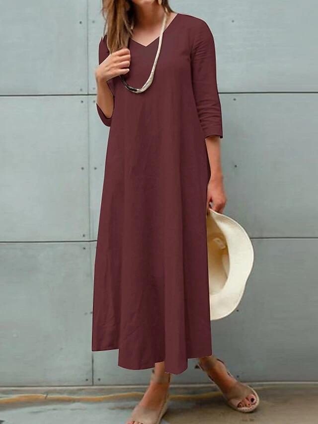 Women’s Plus Size Curve Work Dress A Line Dress Fashion Long Dress Maxi Dress Patchwork V Neck 3/4 Length Sleeve Plain Loose Fit Wine Dark Blue Beige Fall L XL XXL 3XL 4XL