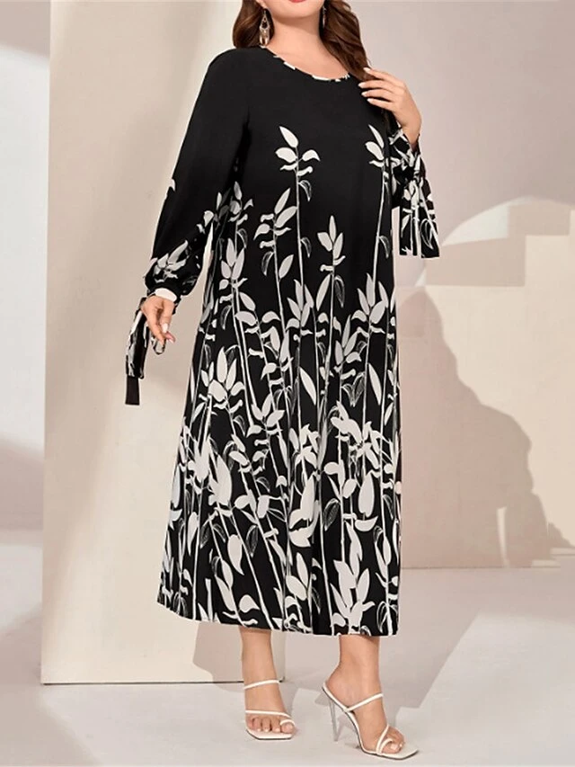 Women’s Plus Size Curve Work Dress Semi Formal Dress Fashion Long Dress Maxi Dress Print Crew Neck Long Sleeve Floral Regular Fit Black Fall Winter L XL XXL 3XL 4XL