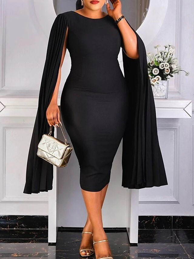 Women‘s Plus Size Curve Work Dress Solid Color Crew Neck Long Sleeve Spring Fall Work Formal Midi Dress Date Vacation Dress