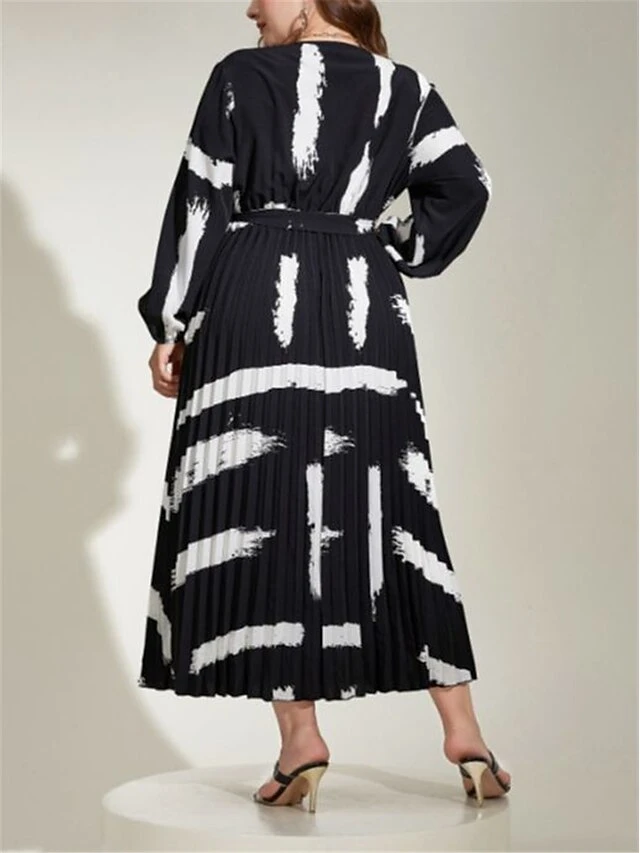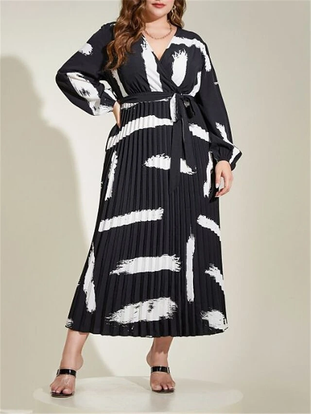 Women’s Plus Size Curve Work Dress Swing Dress Black Dress Fashion Long Dress Maxi Dress Lace Up Print V Neck Long Sleeve Graffiti Regular Fit Black Fall Winter L XL XXL 3XL 4XL