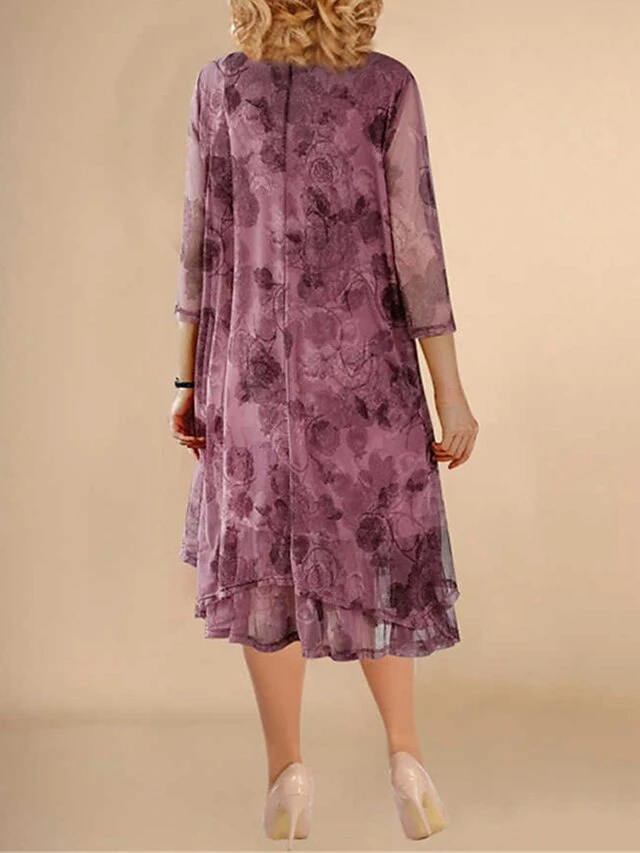 Women‘s Plus Size Curve Work Dress Swing Dress Semi Formal Dress Fashion Midi Dress Mesh Layered Crew Neck 3/4 Length Sleeve Floral Loose Fit Red Summer Spring L XL XXL 3XL 4XL