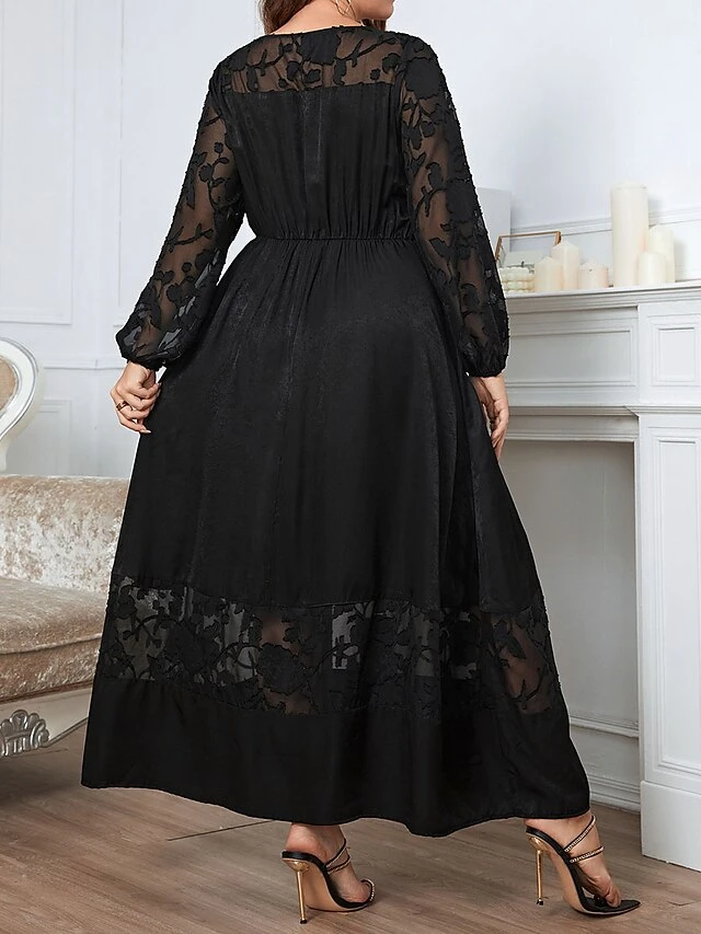 Women’s Plus Size Party Dress Wedding Guest Dress Black Dress Long Dress Maxi Dress Black Long Sleeve Flower Lace Spring Fall Winter Crew Neck Fashion Winter Dress Evening Party Wedding Guest 2023 XL