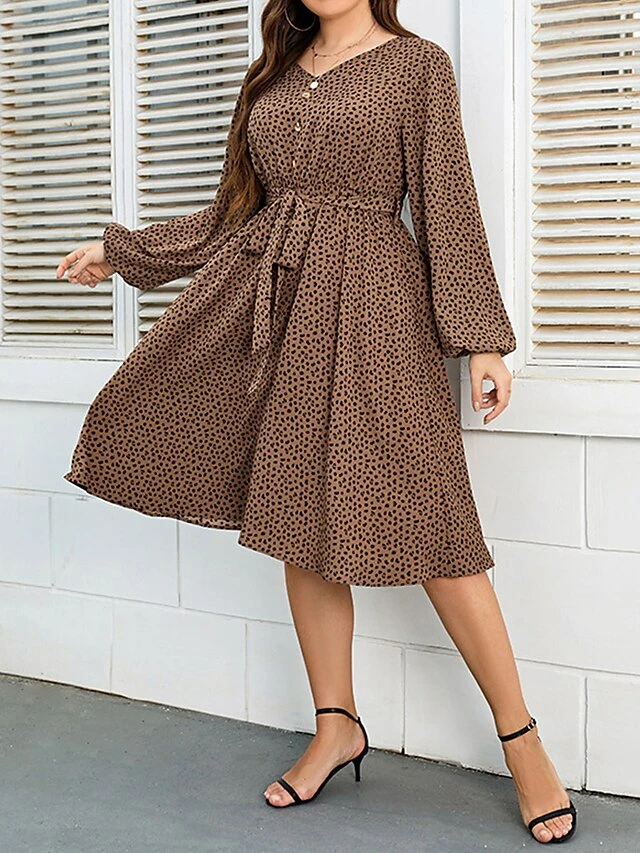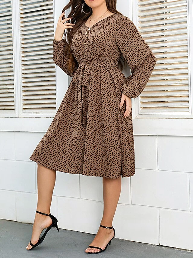 Women’s Plus Size Party Dress Wedding Guest Dress Swing Dress Midi Dress Khaki Long Sleeve Dot Button Spring Fall Winter V Neck Fashion Winter Dress Evening Party Wedding Guest 2023 XL XXL 3XL 4XL