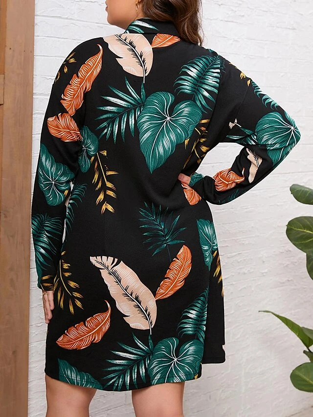 Women’s Plus Size Shirt Dress Casual Dress Midi Dress Outdoor Daily Vacation Polyester Fashion Casual Shirt Collar Lace Up Button Long Sleeve Fall Winter 2023 Regular Fit Black Leaf L XL 2XL 3XL 4XL