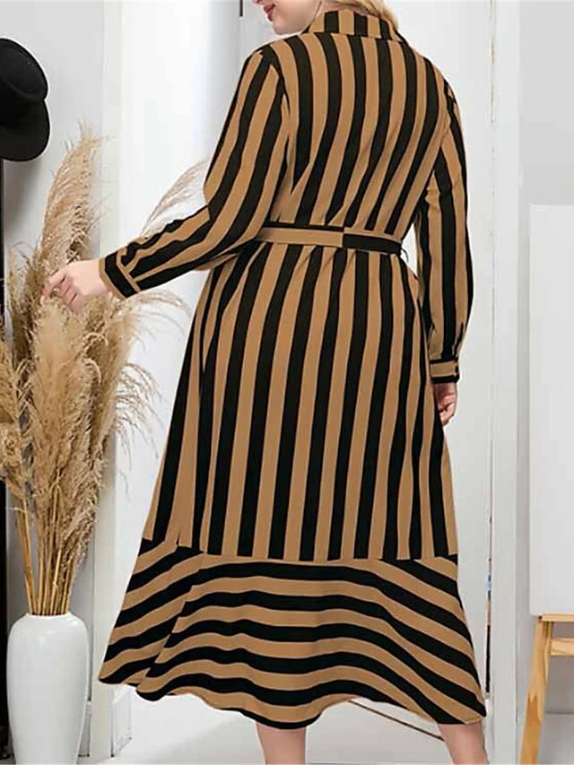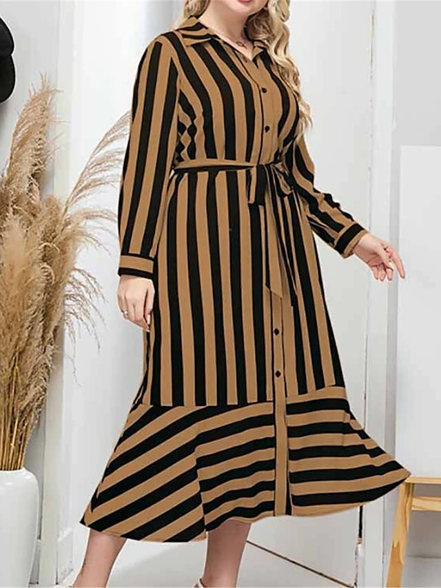 Women’s Plus Size Shirt Dress Casual Dress Swing Dress Midi Dress Outdoor Daily Date Polyester Fashion Modern Shirt Collar Lace Up Button Long Sleeve Fall Winter 2023 Loose Fit Brown Striped L XL 2XL