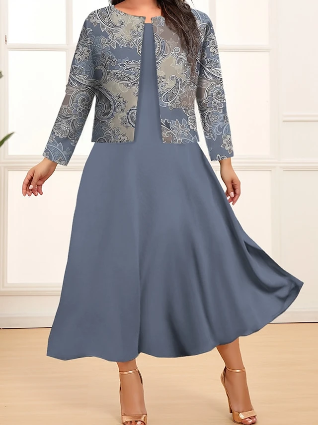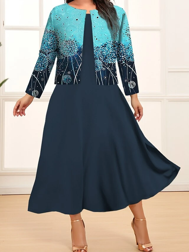 Women’s Plus Size Two Piece Dress Set Casual Dress Paisley Dress Outdoor Office Fashion Streetwear Print Midi Dress Crew Neck Long Sleeve Floral Paisley Regular Fit Navy Blue Blue Fuchsia Fall Winter