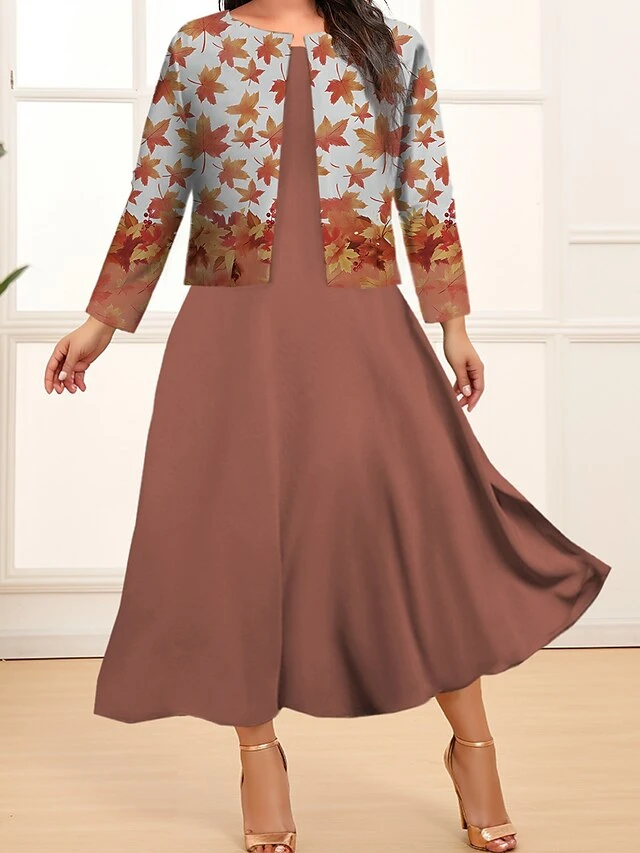 Women’s Plus Size Two Piece Dress Set Casual Dress Swing Dress Outdoor Office Fashion Streetwear Print Midi Dress Crew Neck Long Sleeve Floral Plaid Regular Fit Pink Dark Pink Blue Fall Winter L XL