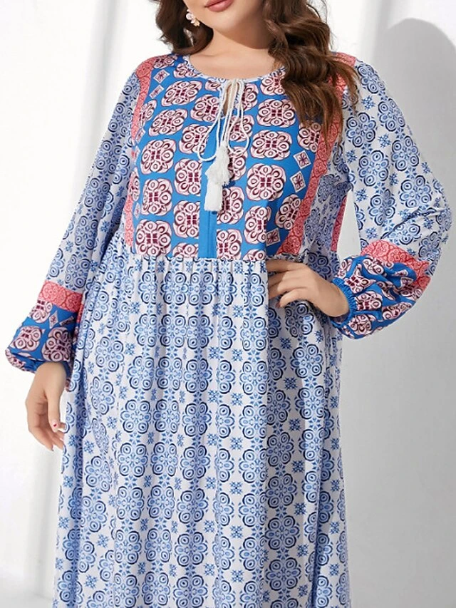 Women’s Plus Size Work Dress Shift Dress Fashion Long Dress Maxi Dress Patchwork Print Off Shoulder Long Sleeve Floral Color Block Loose Fit Blue Fall L XL XXL 3XL 4XL
