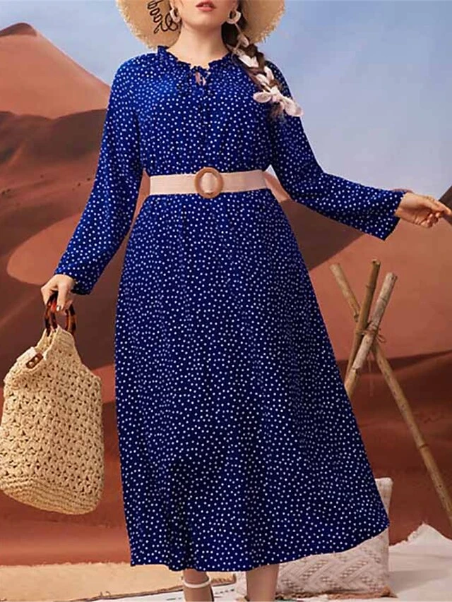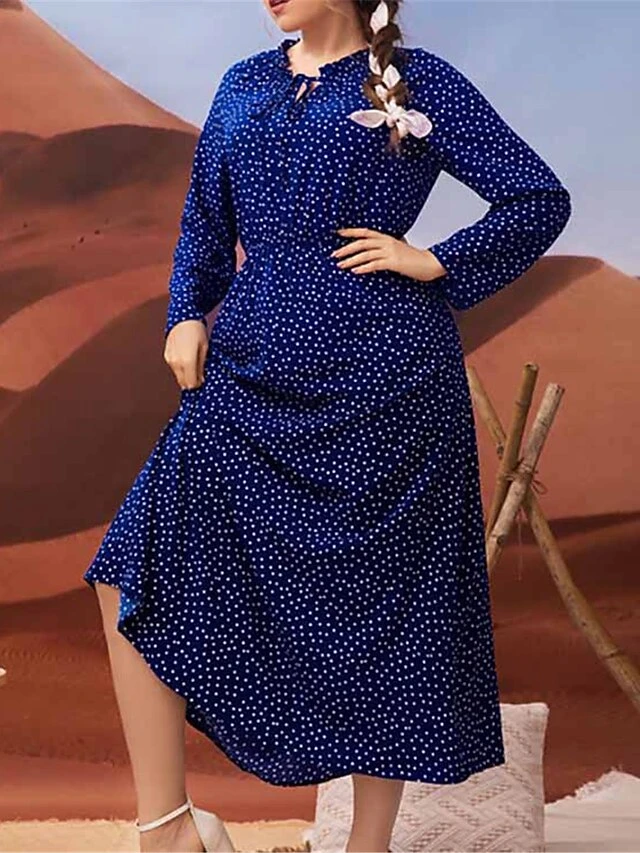Women’s Plus Size Work Dress Swing Dress Semi Formal Dress Fashion Long Dress Maxi Dress Print V Neck Long Sleeve Polka Dot Loose Fit Navy Blue Fall Winter L XL XXL 3XL 4XL