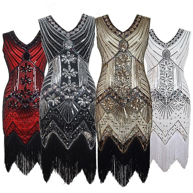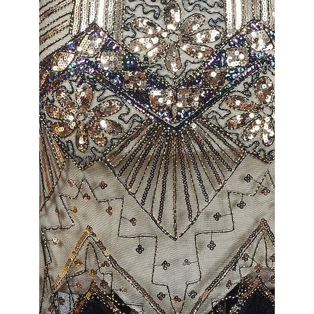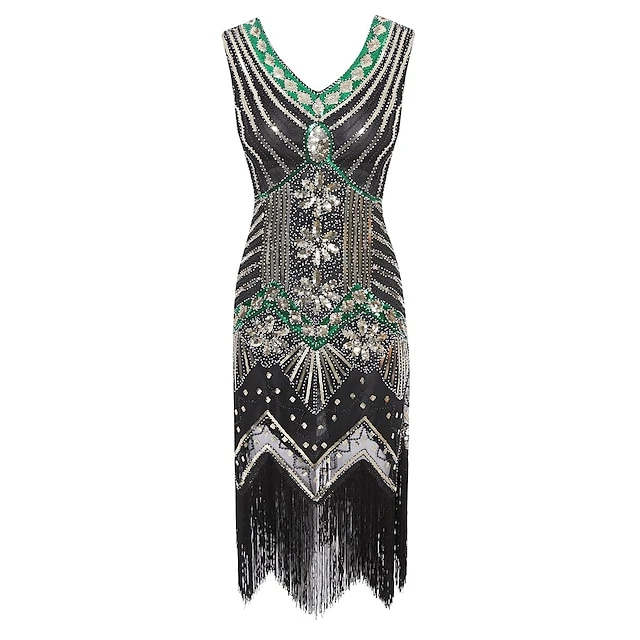 Women’s Retro 1920s Fringe Dress Midi Dress Party Halloween Sequins Tassel Fringe Floral V Neck Sleeveless Regular Fit Spring Fall 2023 Black White S M L XL