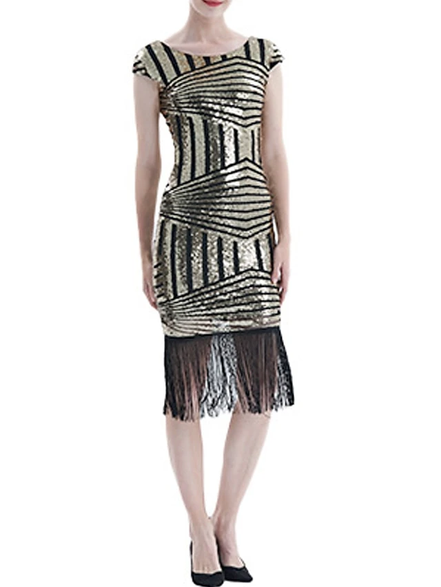 Women’s Retro 1920s Fringe Dress Midi Dress Party Halloween Sequins Tassel Fringe Geometric V Neck Short Sleeve Regular Fit Spring Fall 2023 Silver Pink S M L XL