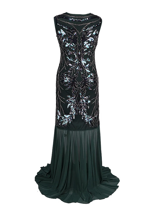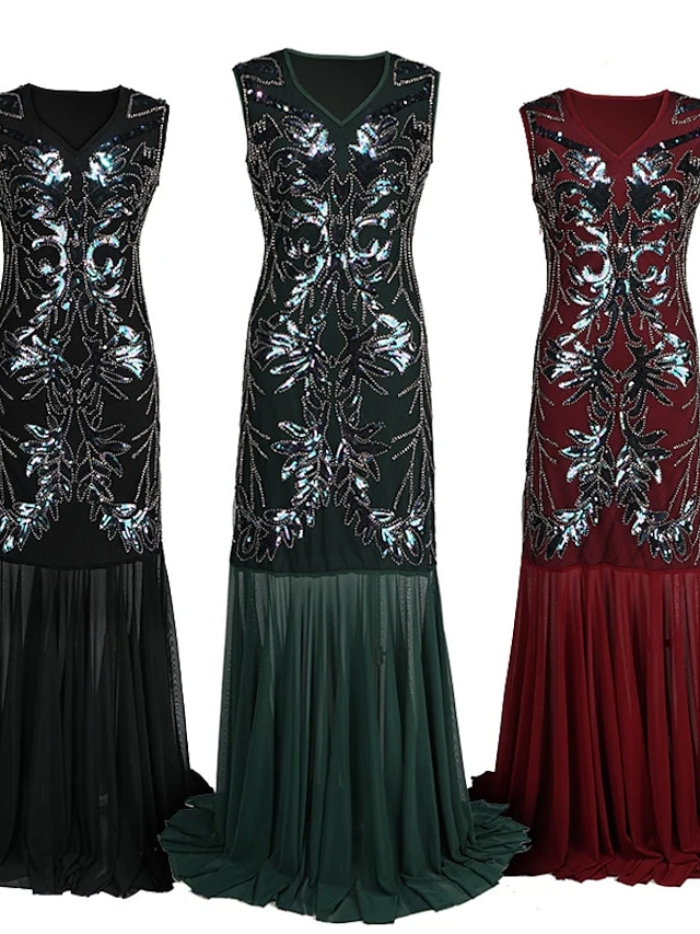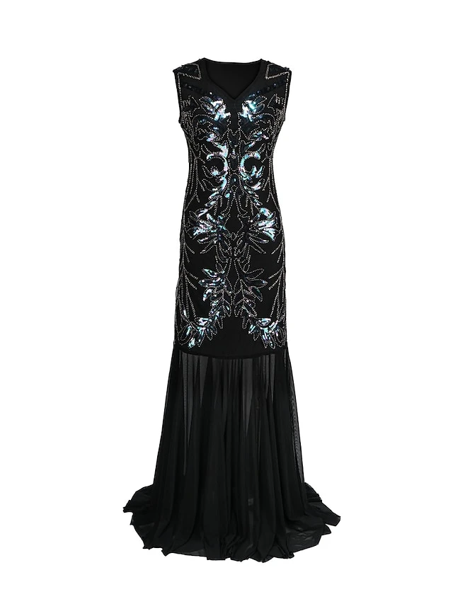 Women’s Retro 1920s Sequin Dress Long Dress Maxi Dress Party Evening Party Sequins Patchwork Floral V Neck Sleeveless Regular Fit Spring Fall 2023 Black Red S M L XL