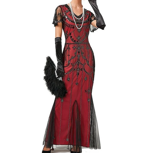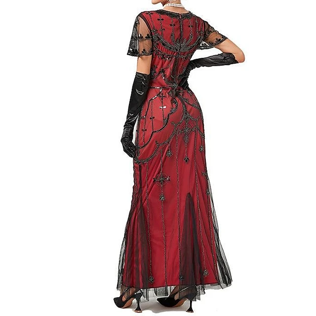 Women’s Retro 1920s Sequin Dress Long Dress Maxi Dress Party Halloween Sequins Mesh Floral V Neck Short Sleeve Regular Fit Spring Fall 2023 Black Red XS S M L