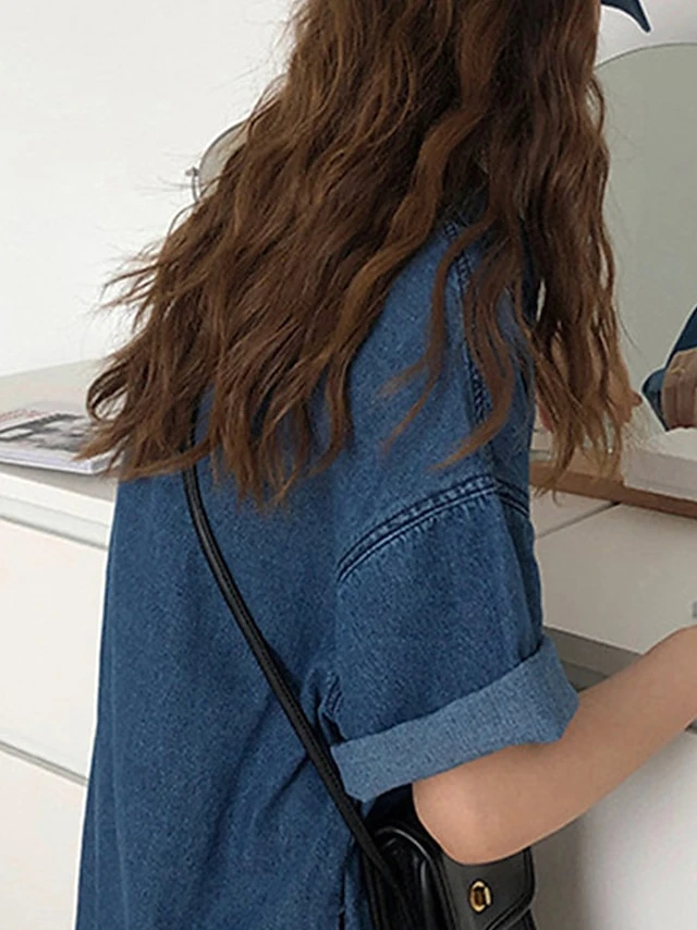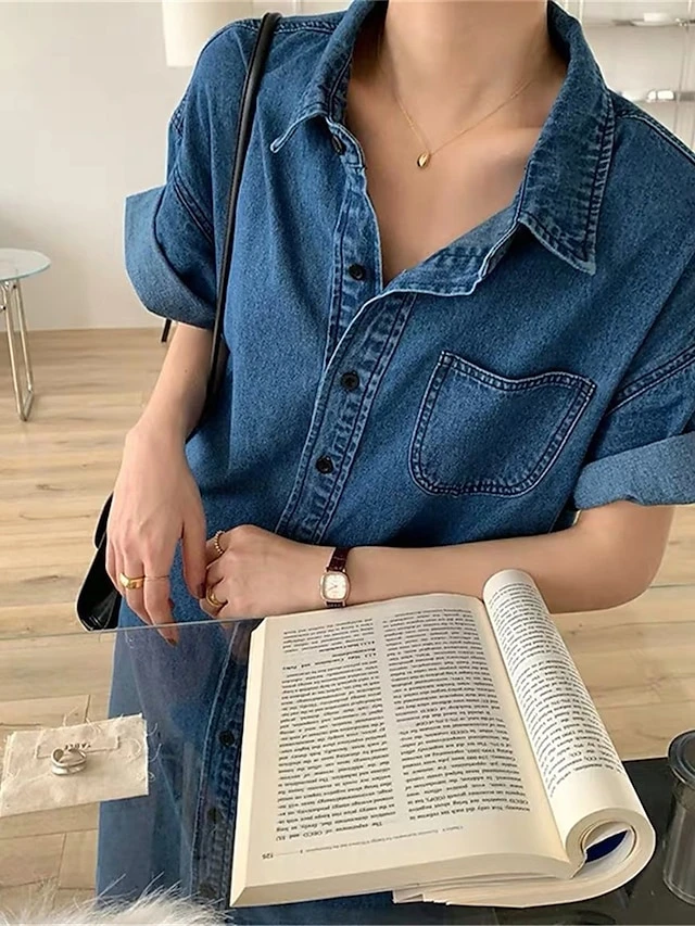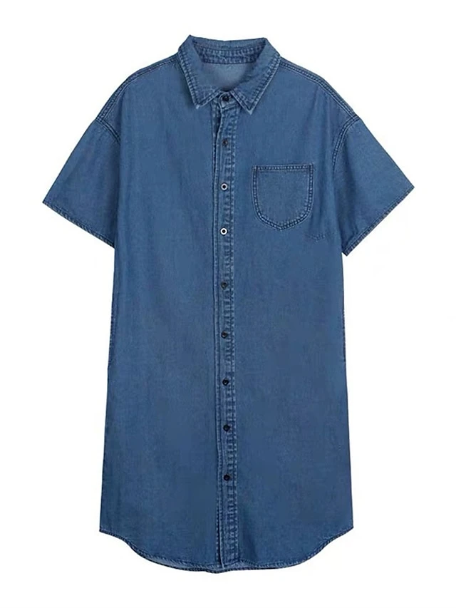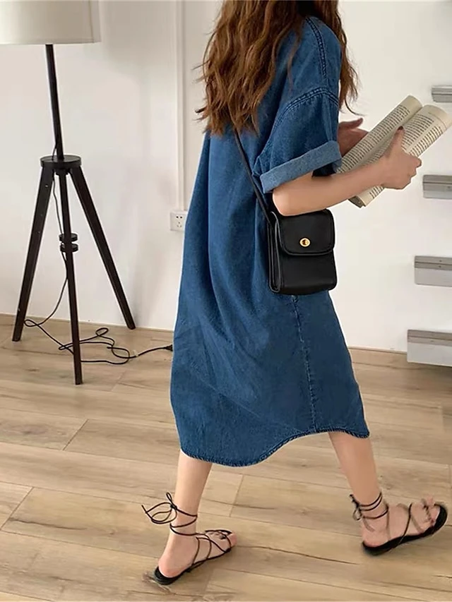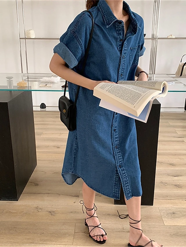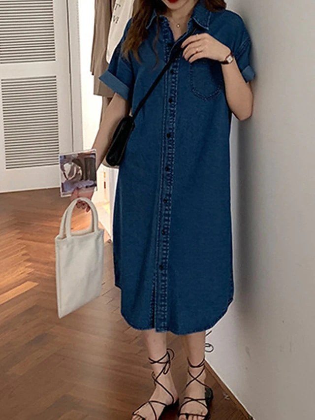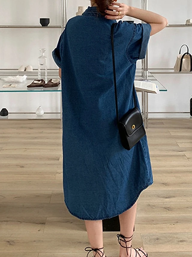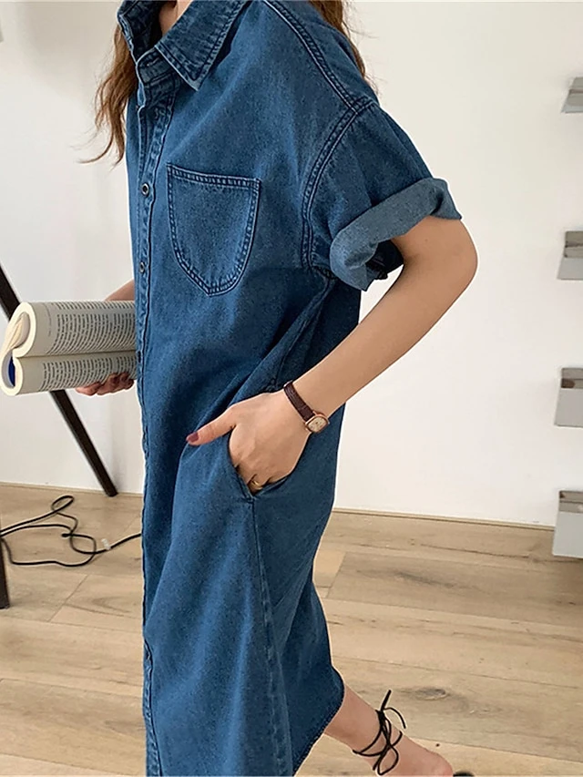 Women’s Shift Dress Denim Shirt Dress Midi Dress Denim Fashion Casual Outdoor Daily Vacation Shirt Collar Button Pocket Short Sleeve Summer Spring Fall 2023 Loose Fit Blue Plain S M L XL