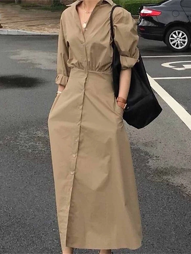 Women’s Shirt Dress Casual Dress Maxi Long Dress Outdoor Daily Vacation Cotton Basic Classic Shirt Collar Button Long Sleeve Summer Spring Fall 2023 Loose Fit Black Sky Blue Khaki Pure Color S M L XL