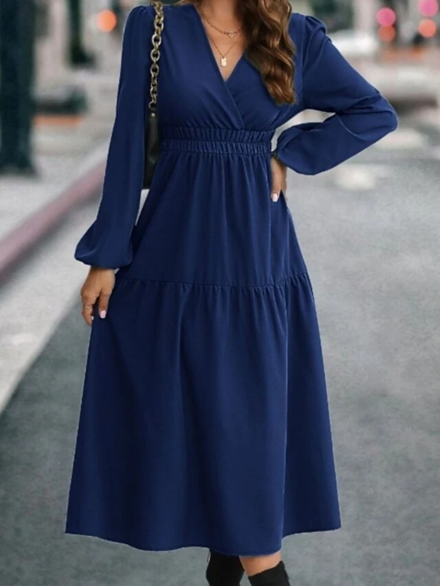 Women’s Swing Dress Plain Dress Empire Waist Dresses Long Dress Maxi Dress Ruched Outdoor Street Daily Active Fashion V Neck Long Sleeve 2023 Regular Fit Blue Green Color S M L XL Size