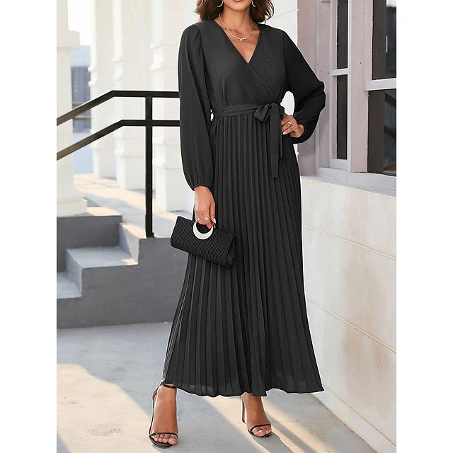 Women’s Swing Dress Plain Dress Long Dress Maxi Dress Lace Up Pleated Daily Holiday Date Fashion Modern V Neck Long Sleeve 2023 Regular Fit Black Yellow Blue Color S M L XL XXL Size